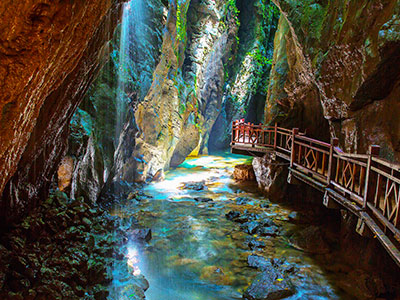 張家界朝陽地縫景區(qū)地處慈利縣朝陽境內(nèi),全長(zhǎng)5公里,垂直深度近200米。朝陽地縫為趙家埡庫區(qū)流水經(jīng)幾億年沖刷而形成的100多米深的崖縫,兩崖最窄處僅一米多寬,景色集奇、秀、險(xiǎn)、野、幽于一體。景區(qū)內(nèi)溪水清澈,空氣清新,冬暖夏涼,四季如春,是旅游觀光、避暑休閑、考察探險(xiǎn)的好去處。
